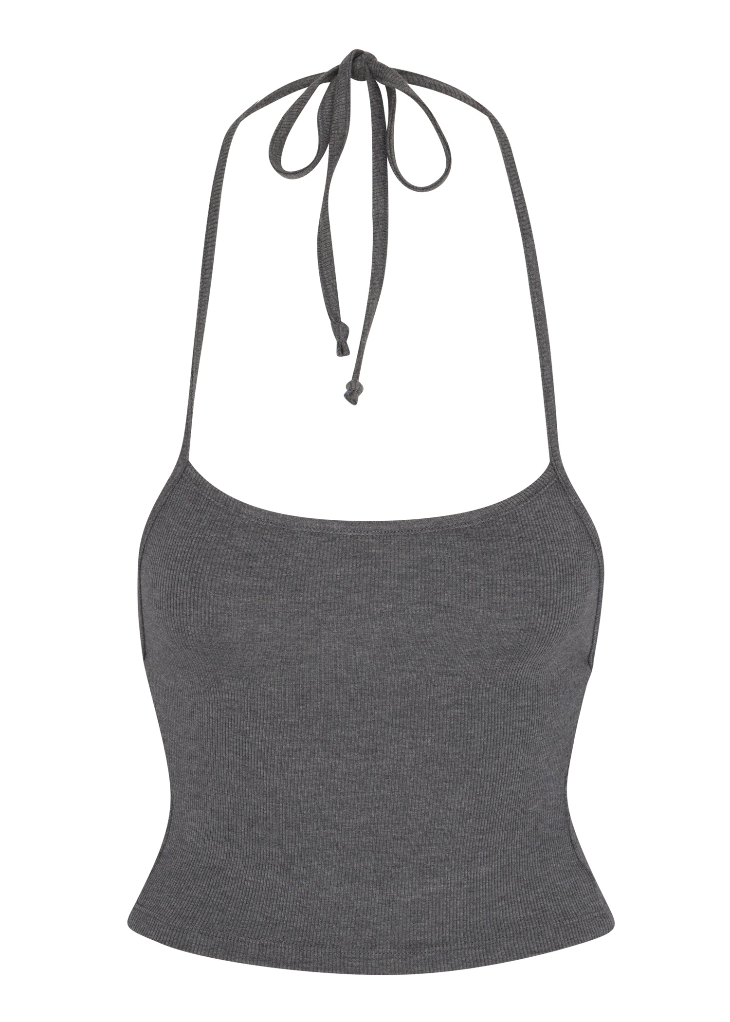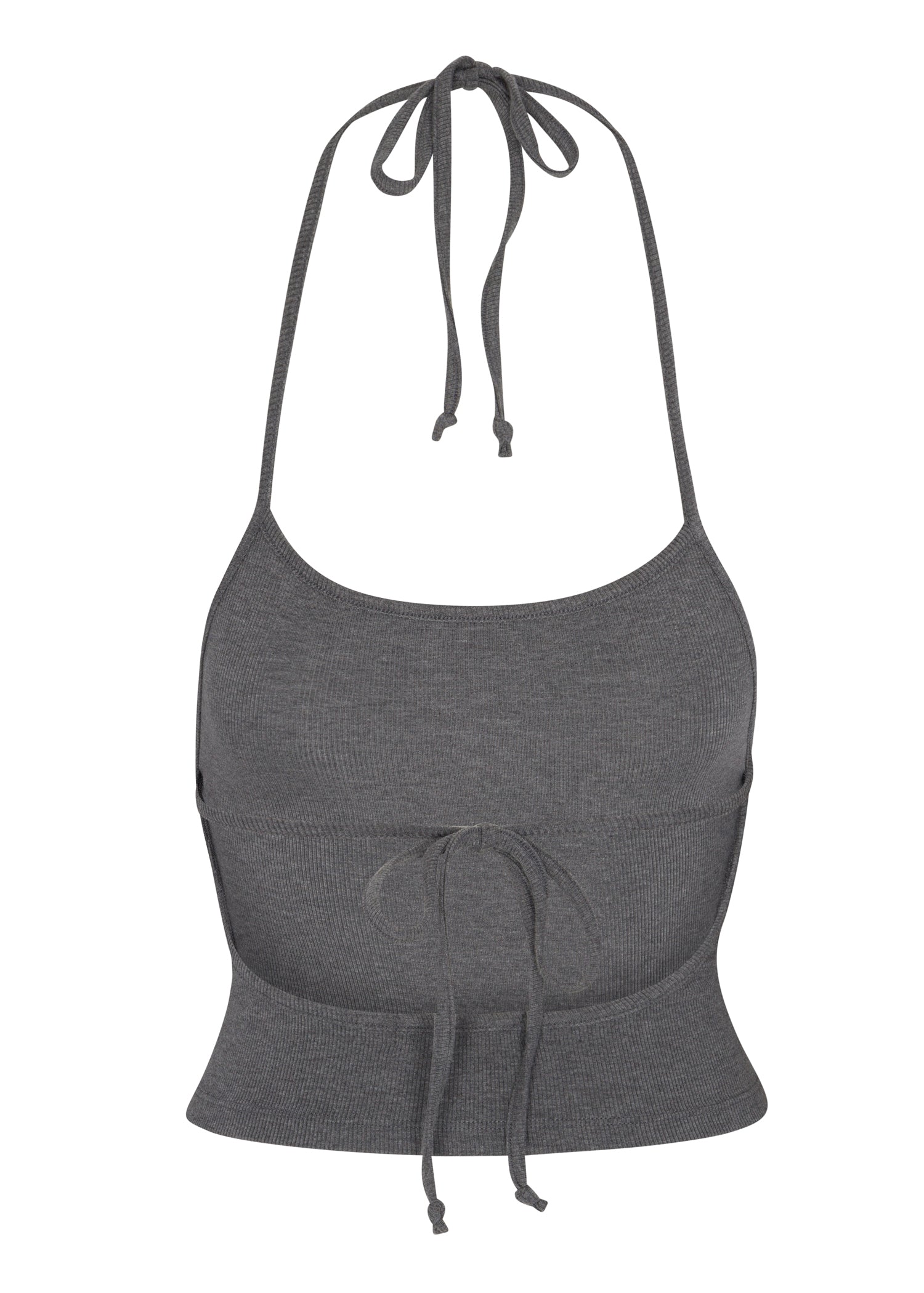 This one-of-one grey ribbed knit crop top is crafted from sustainably sourced eucalyptus fibers. It features a flattering back detail with a gorgeous tie that can be worn in multiple ways.