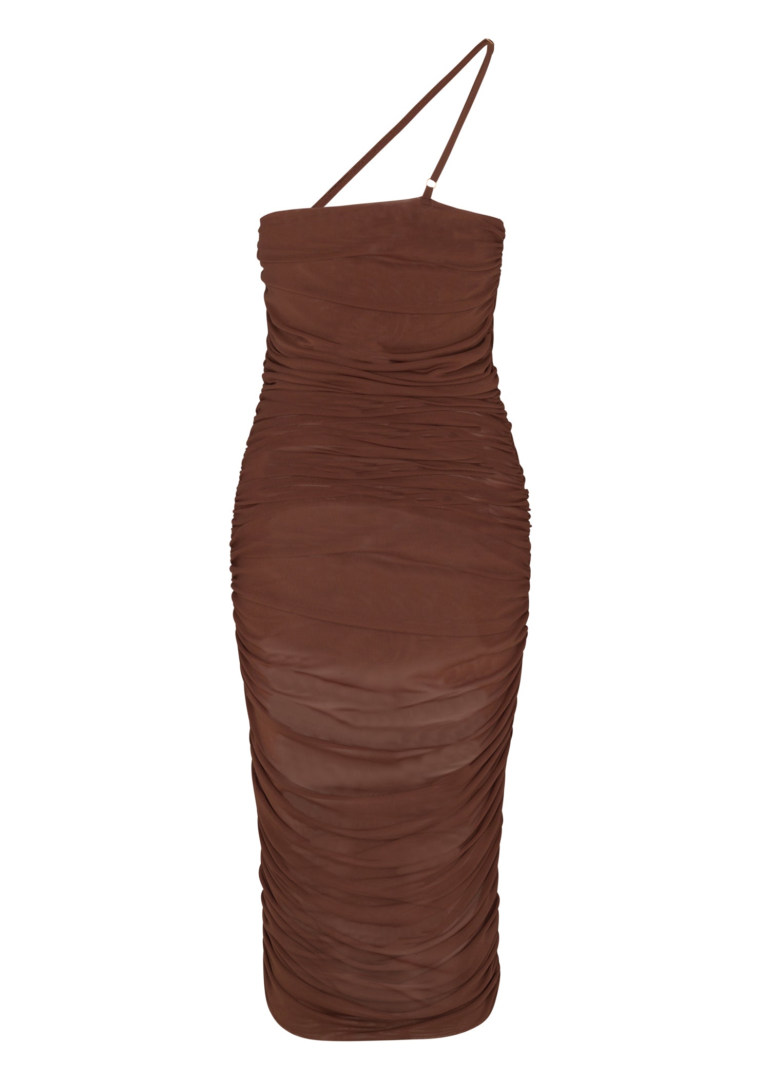This one-of-one chocolate slightly sheer mesh midi dress is perfect for summer. It features a single strap with a runched fit to highlight your curves. Also includes an adjustable strap.