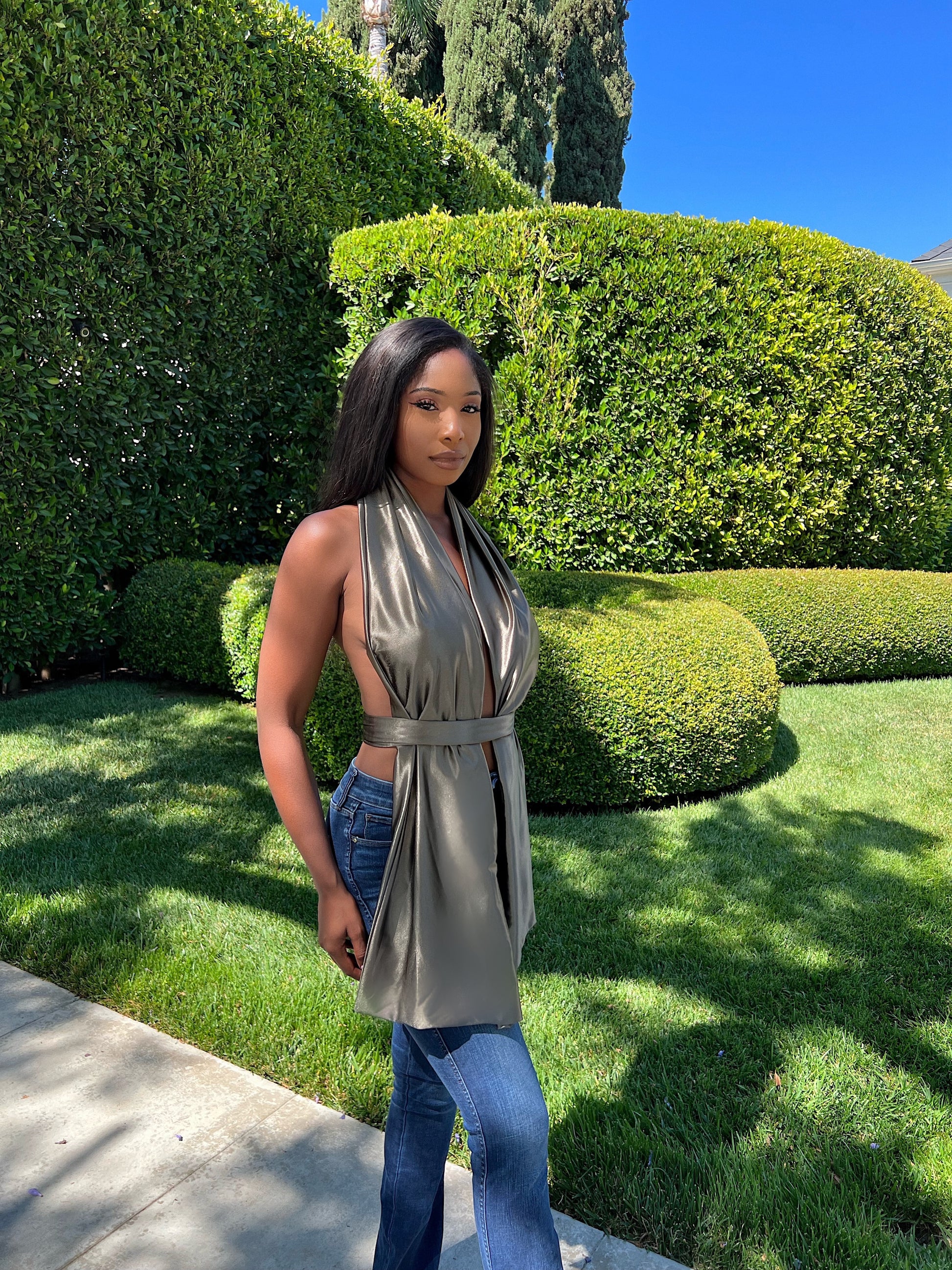 This wrap top in satin is designed to be worn multiple ways. Wear it draped across your neck with the waist cinched, or crossover front to fasten at the back.